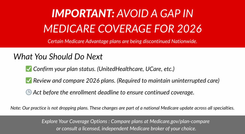 Our Practice is not affiliated with The Heppner Group, Medicare, or any insurance plan, and does not receive compensation for sharing this information. The Heppner Group is an independent, licensed brokerage provided here solely as an educational resource. Patients are encouraged to review their plan options through Medicare.gov or with any licensed broker of their choice. Our practice does not sell insurance and does not provide legal or tax advice. Coverage and network participation depend on the plan you select.
